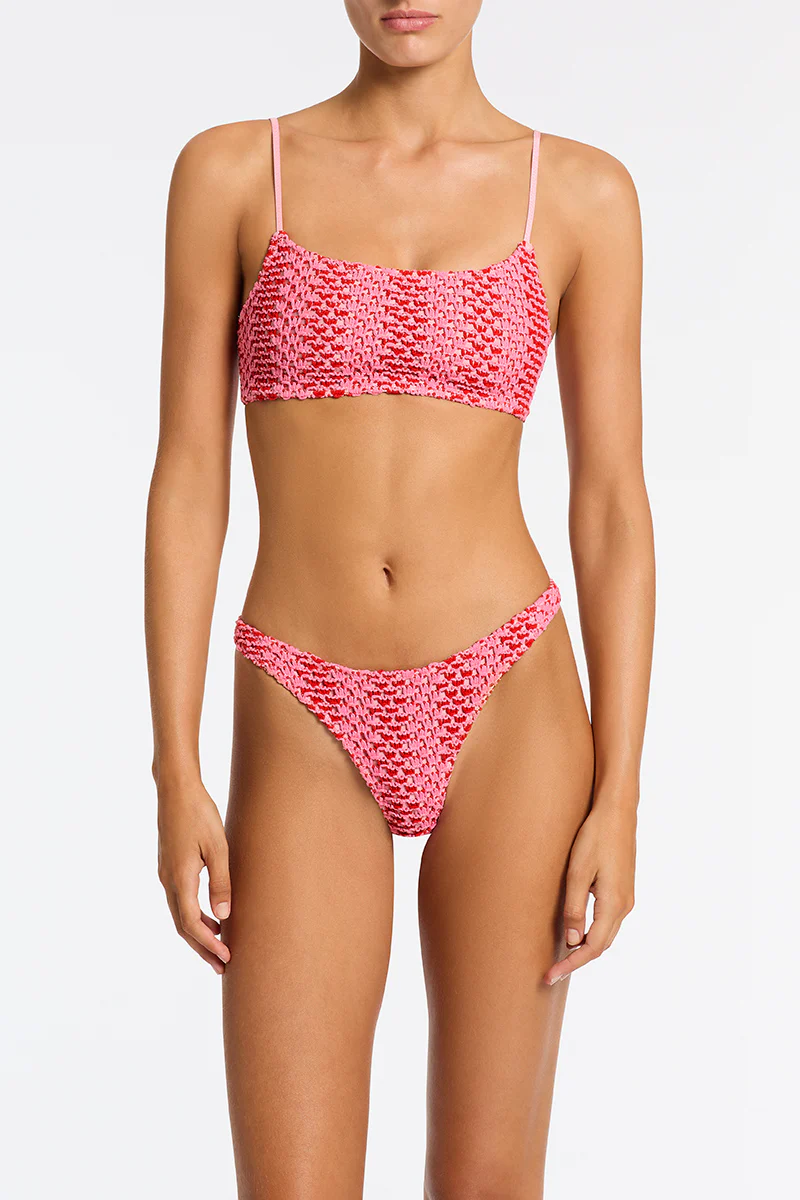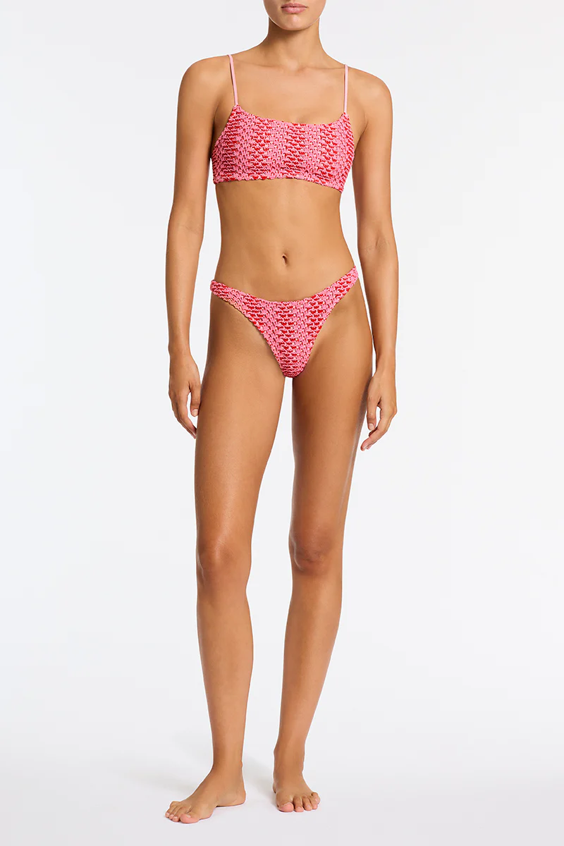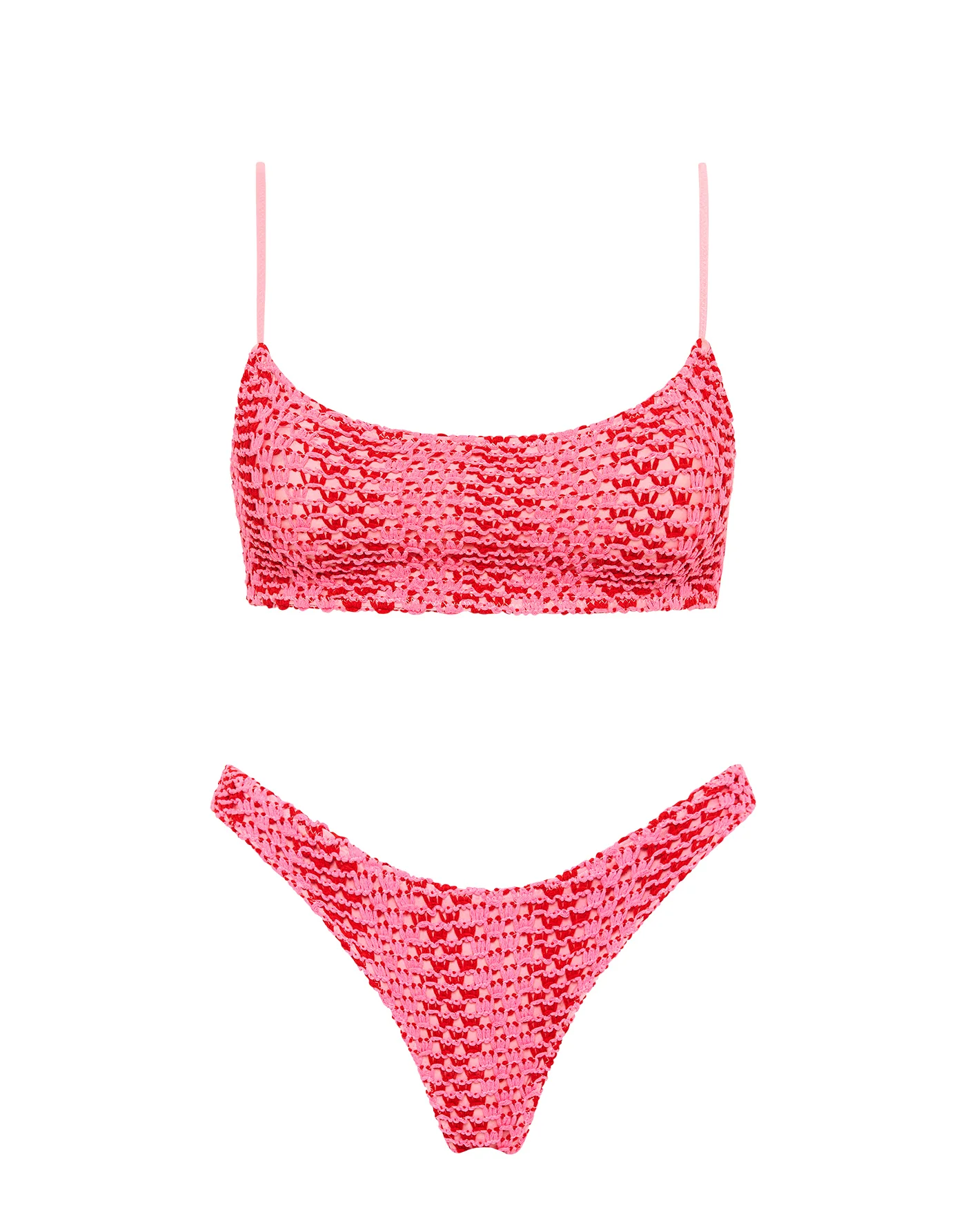 A scoop crop bikini top in pink crochet with matching high waist bottoms. Strappy crop top with adjustable shoulder straps and back clasp fastening. Choose from either cheekiest. cheeky or normal bottom for a little more coverage. This bikini also comes with a neoprene zip bag.