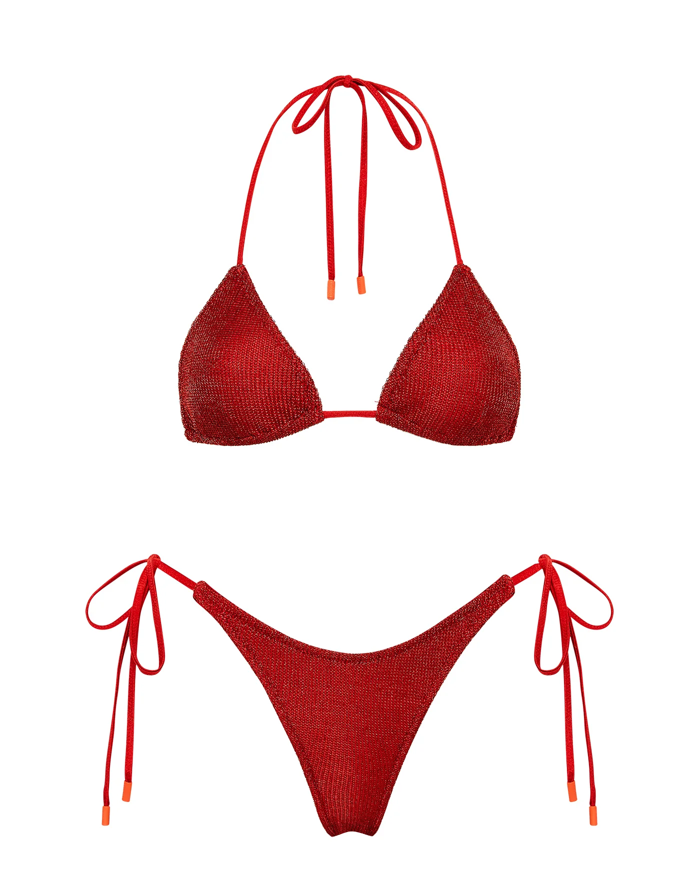 A textured side-tie bikini in red. Fully adjustable triangle top and bottoms with self-tie fastenings. Choose from either cheekiest or cheeky bottoms. This bikini also comes with a neoprene zip bag.