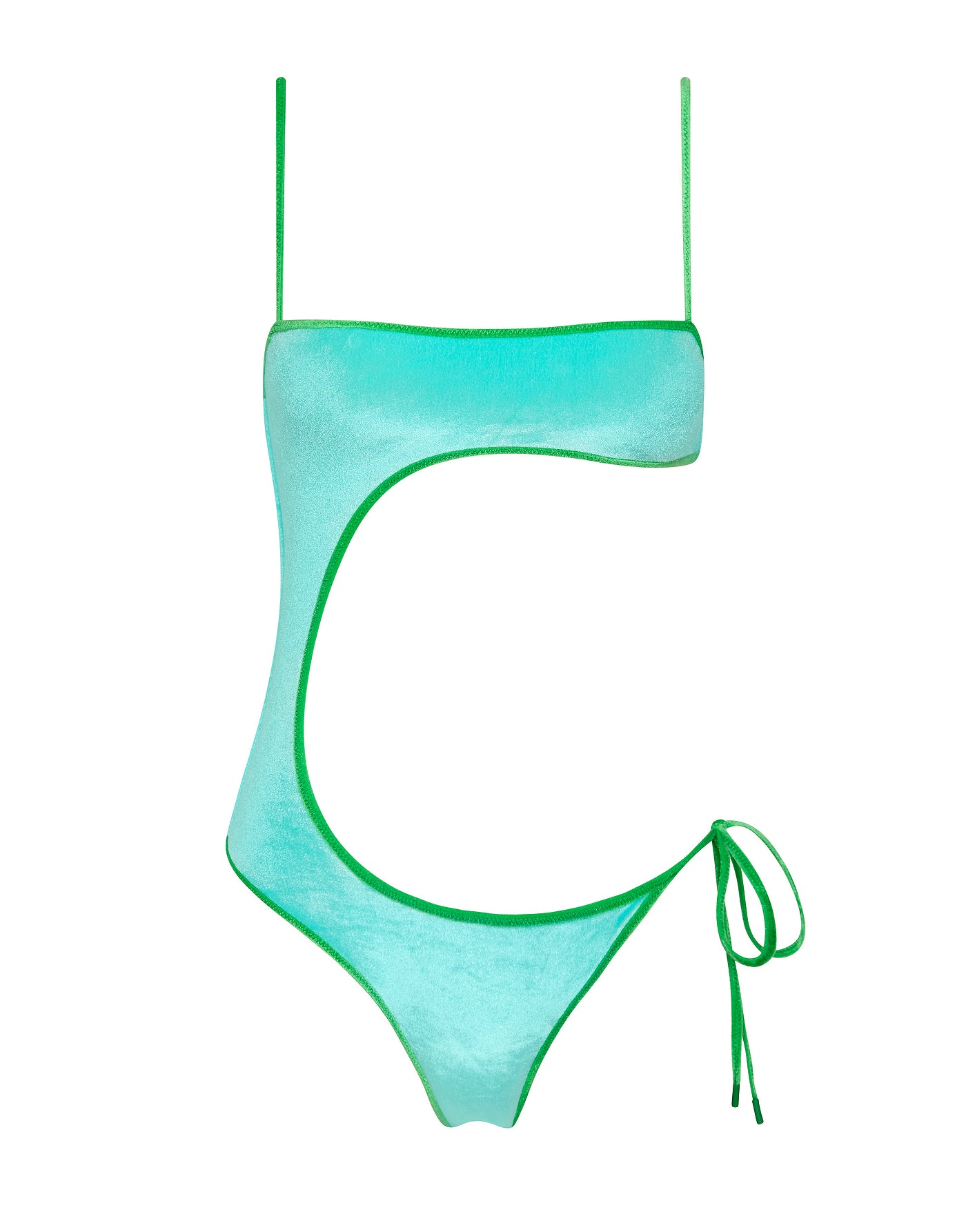 A square neck full piece in blue velvet with green piping. Features a cut-out on the side of the body with a self-tie detail and cheeky bottom. Fully adjustable shoulder straps and back clasp fastening.This full piece also comes with a neoprene zip bag.