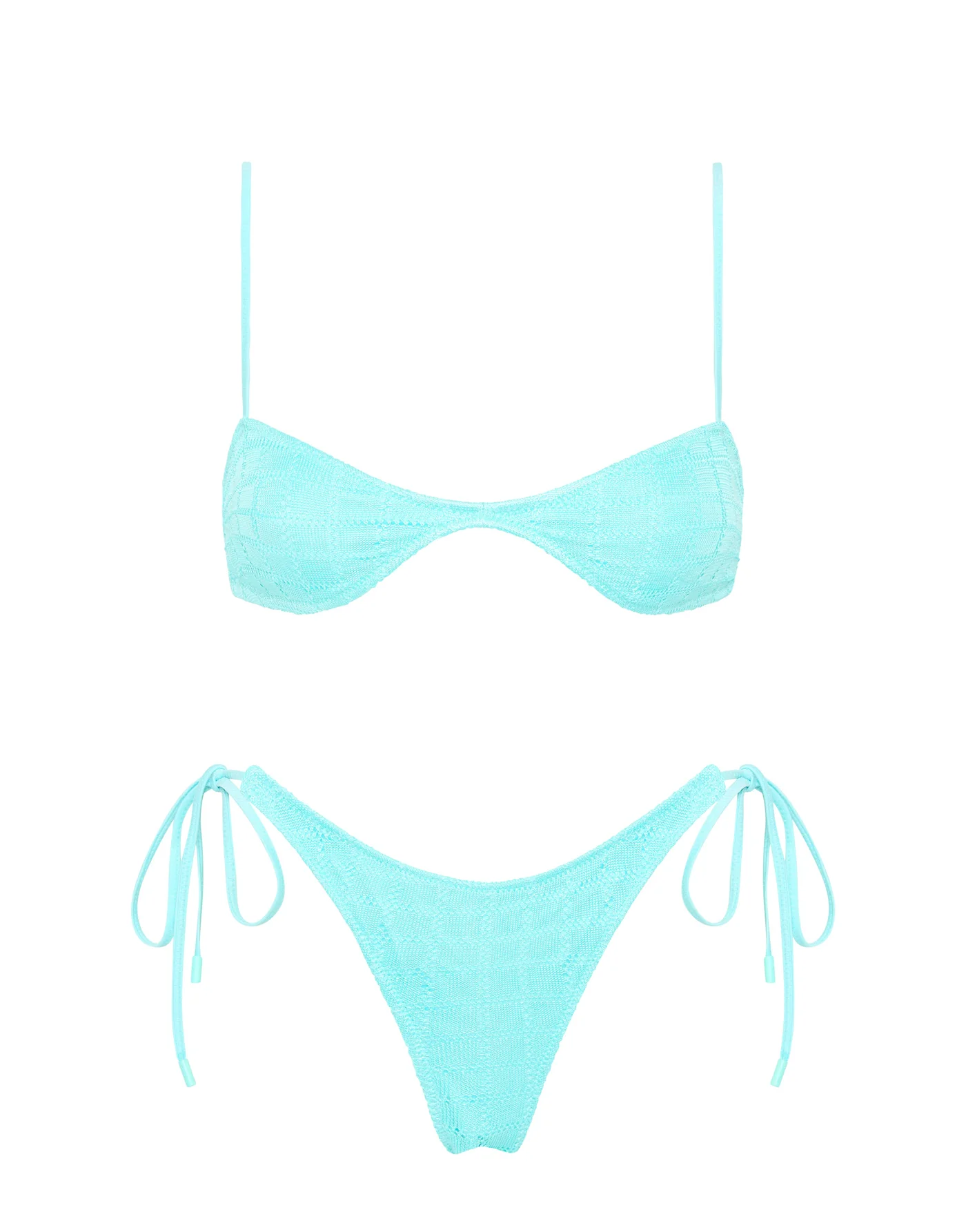 A textured scoop crop bikini top in blue with matching side-tie bottoms. Ruched side detailing with adjustable shoulder straps and back clasp fastening. Choose from either cheekiest or cheeky bottoms. This bikini also comes with a neoprene zip bag.
