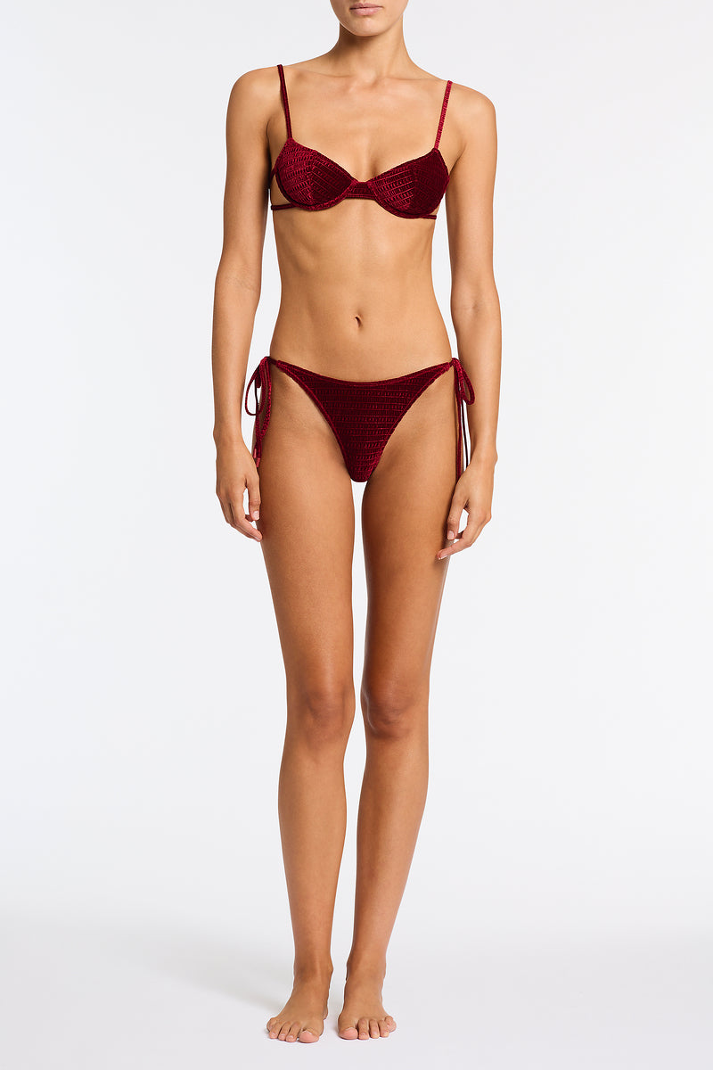 A bra style top with side cut-outs in burgundy textured velvet. Features a non-padded cup with adjustable shoulder straps and back self-tie fastenings. Choose from either cheekiest or cheeky bottoms. This bikini also comes with a neoprene zip bag.