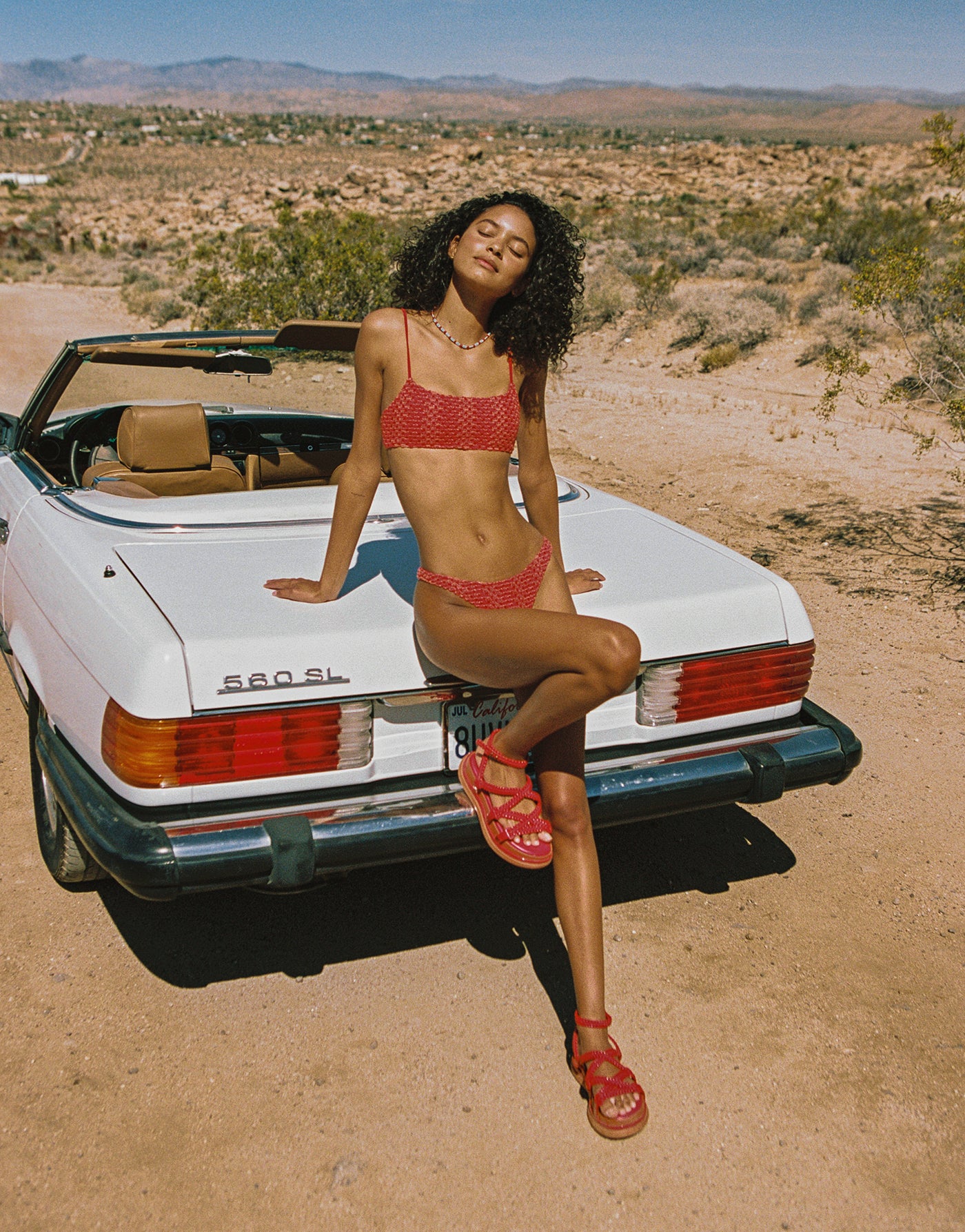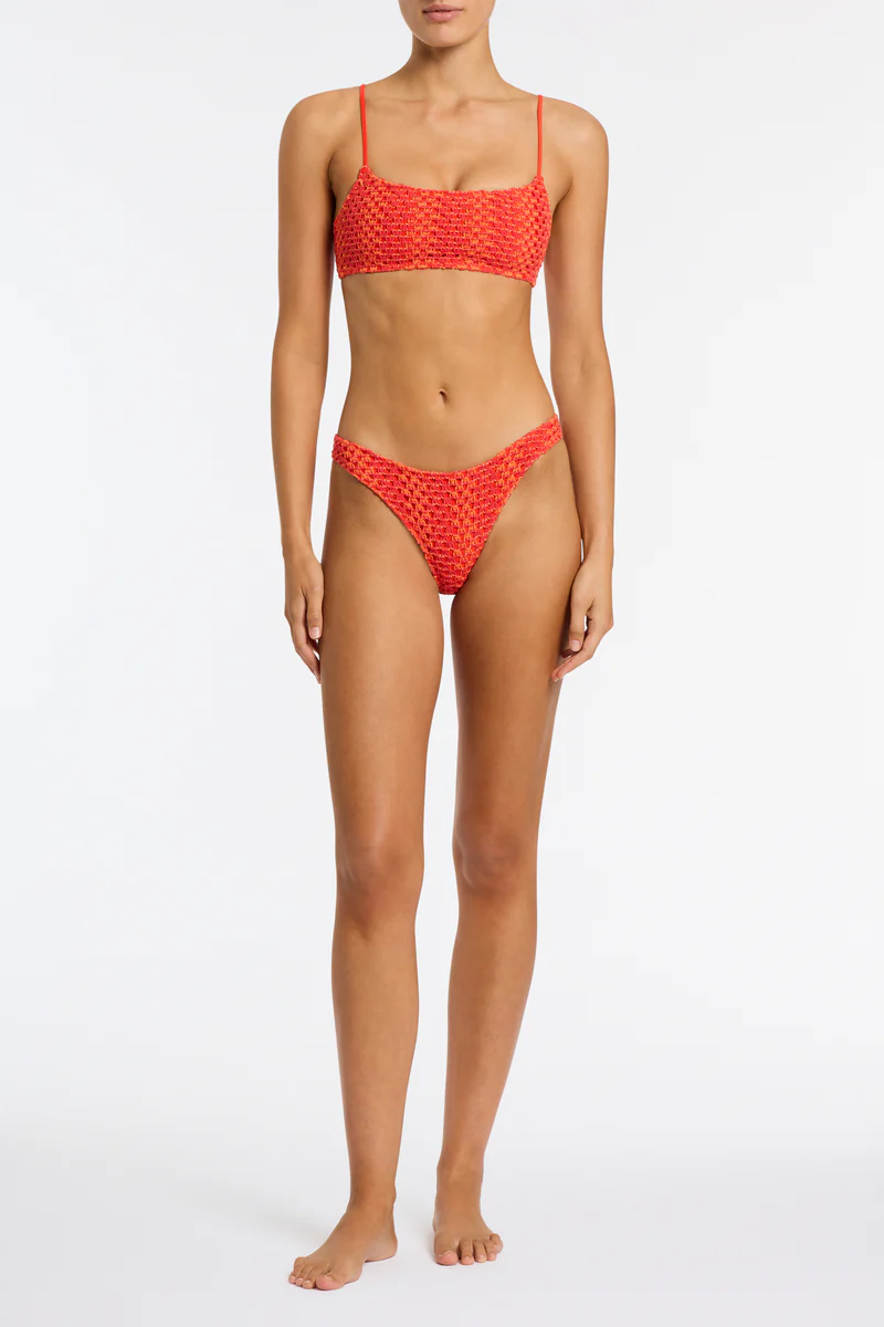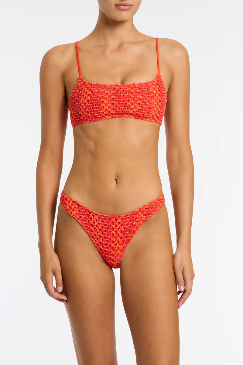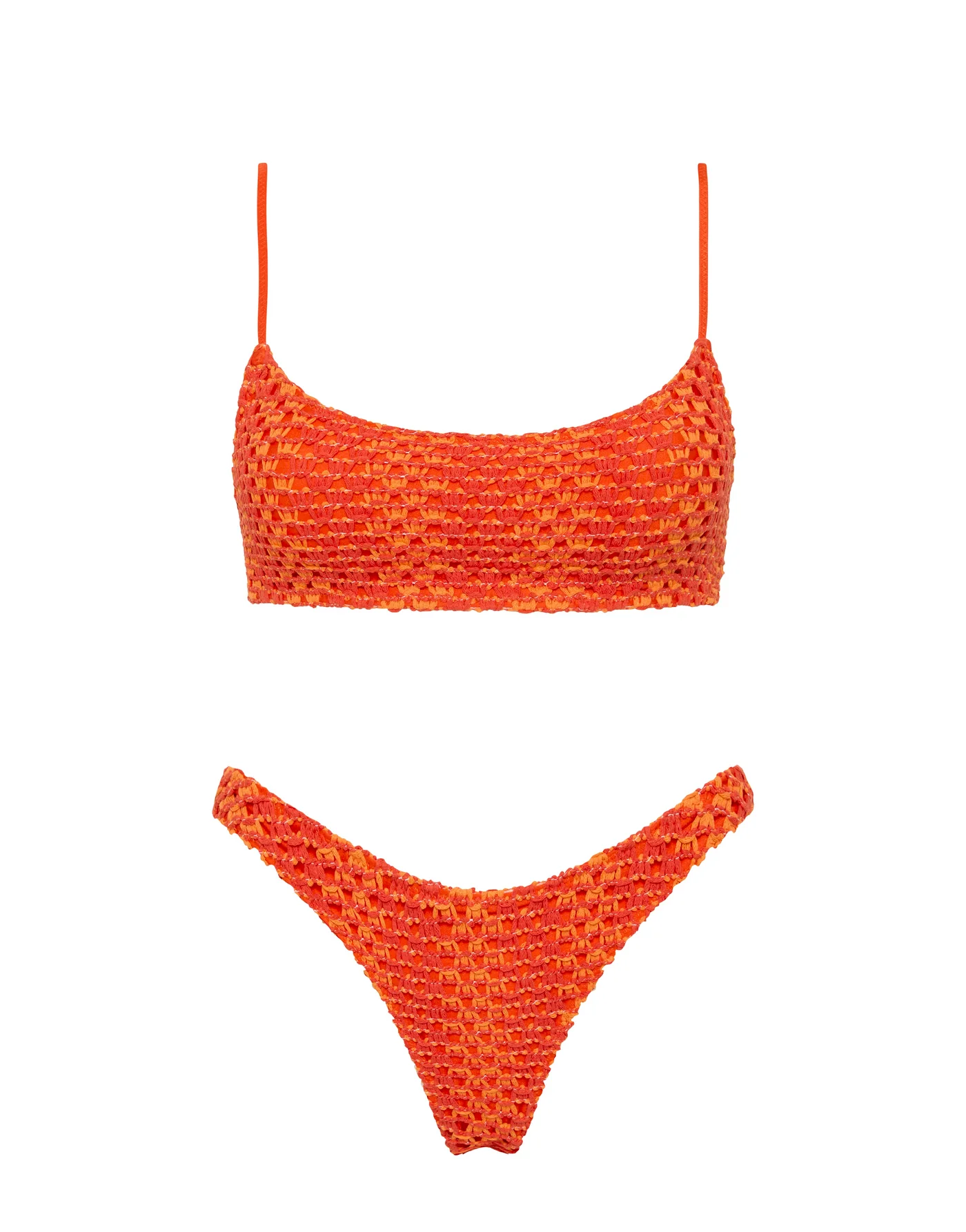 A scoop crop bikini top in red crochet with matching high waist bottoms. Strappy crop top with adjustable shoulder straps and back clasp fastening. Choose from either cheekiest. cheeky or normal bottom for a little more coverage. This bikini also comes with a neoprene zip bag.