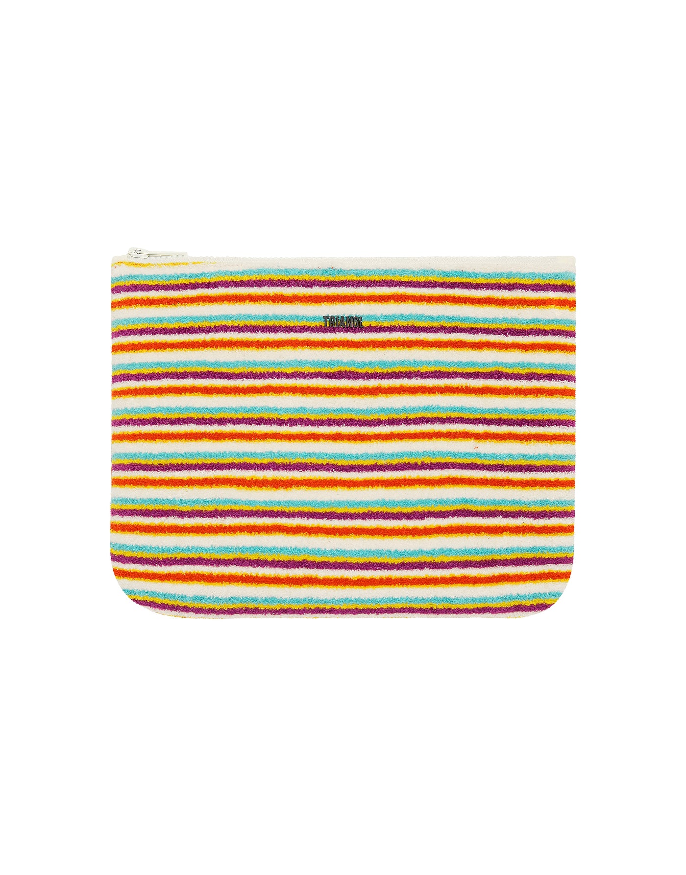 A bra style top featuring a non-padded cup with adjustable shoulder straps and back clasp fastening in rainbow terry stripe. Matching bottoms feature adjustable coverage front and back. This bikini also comes with a neoprene zip bag.