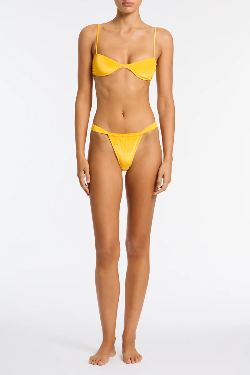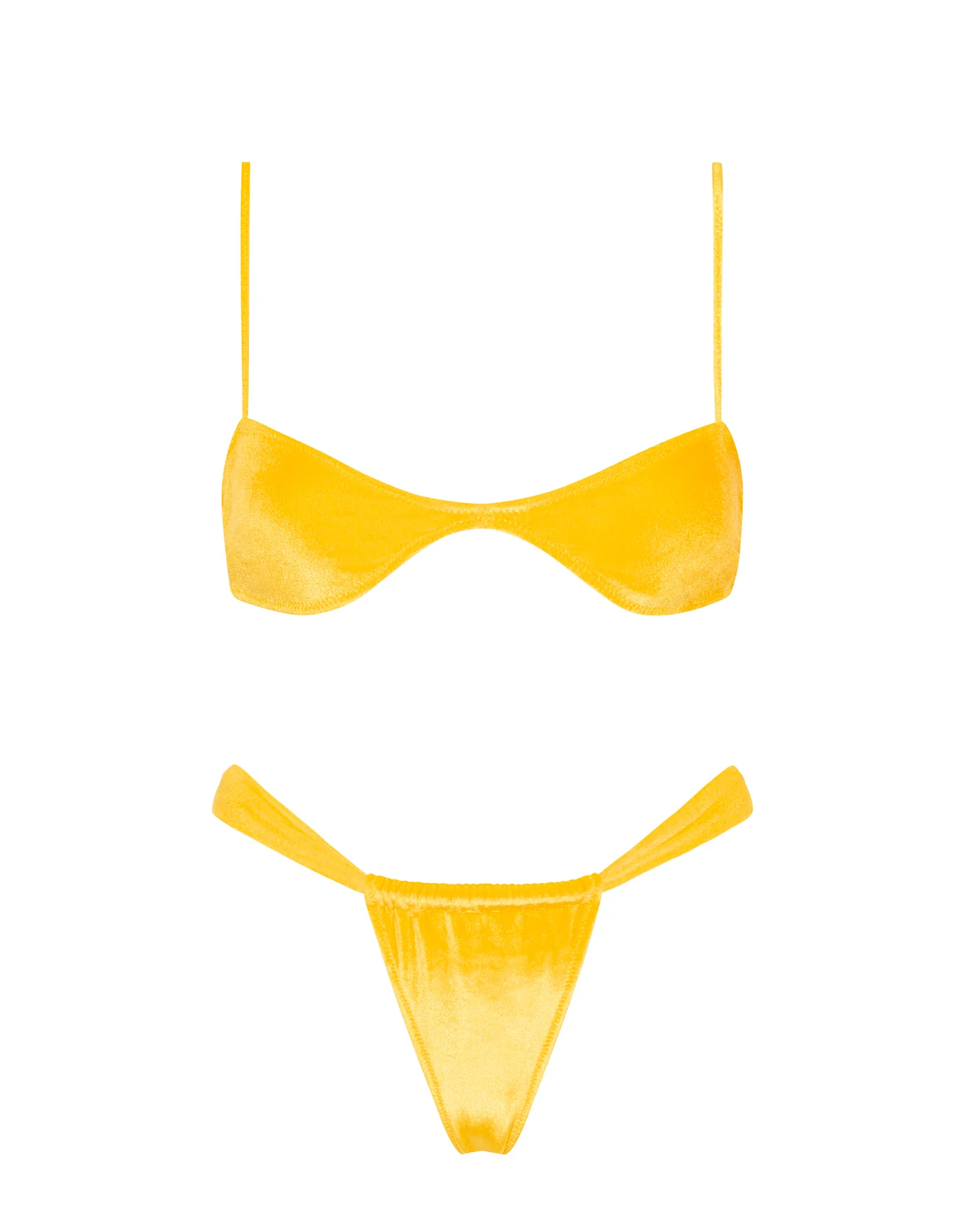 A scoop crop bikini top in yellow velvet with ruched side detailing and adjustable shoulder straps and back clasp fastening. Matching bottoms feauture adjustable coverage front and back. This bikini also comes with a neoprene zip bag.
