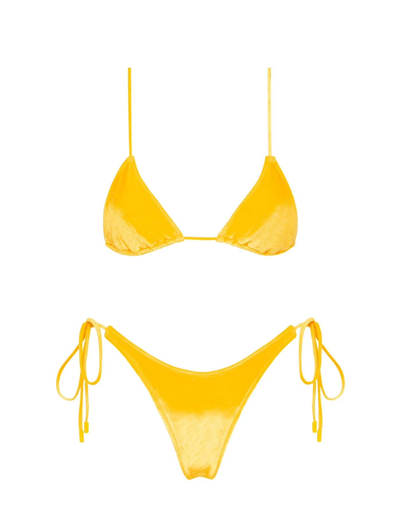 A side-tie bikini in yellow velvet featuring adjustable shoulder straps and bottoms with self-tie fastenings. Choose from either cheekiest or cheeky bottoms. This bikini also comes with a neoprene zip bag.