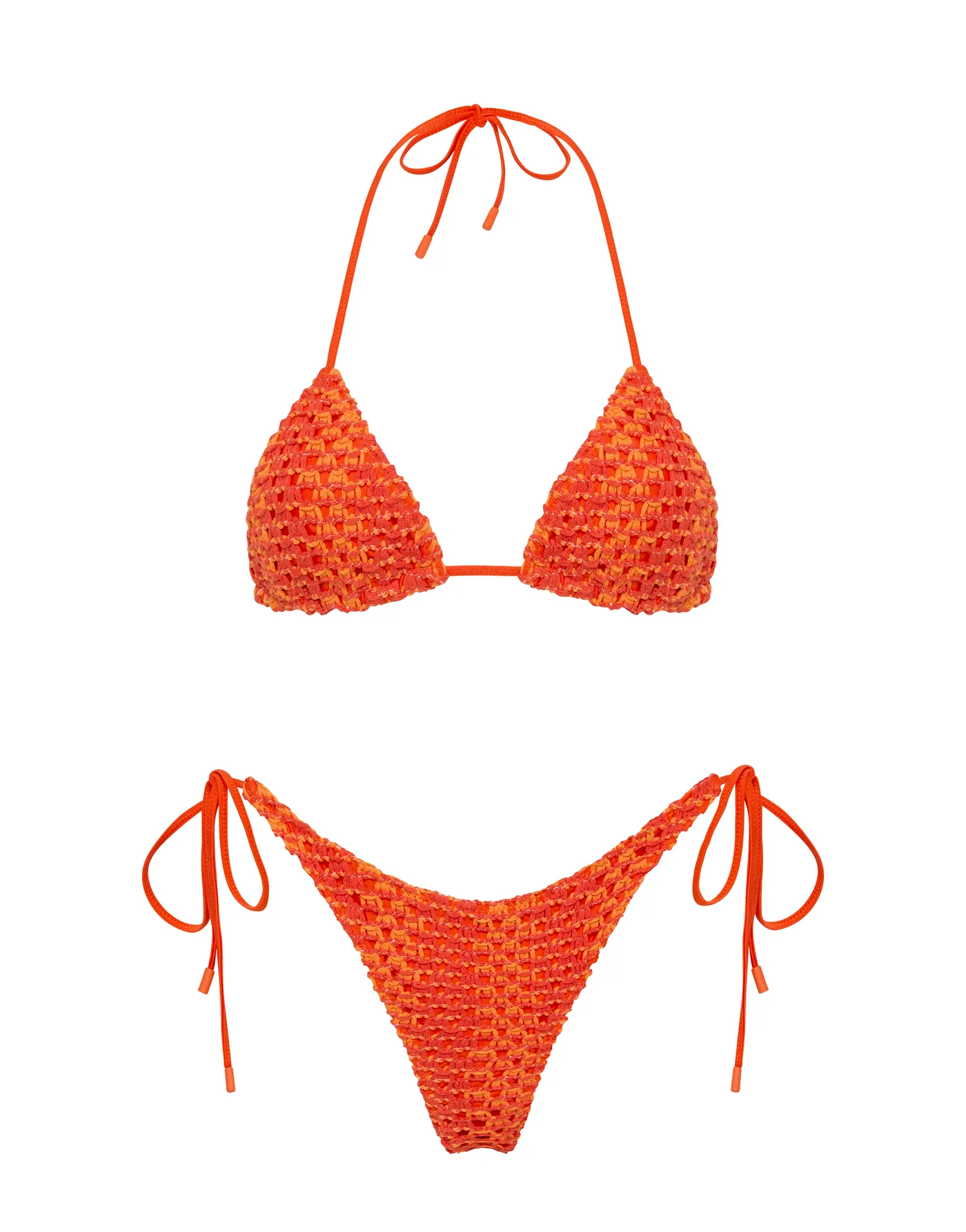 A scoop crop bikini top in red crochet with matching high waist bottoms. Strappy crop top with adjustable shoulder straps and back clasp fastening. Choose from either cheekiest. cheeky or normal bottom for a little more coverage. This bikini also comes with a neoprene zip bag.