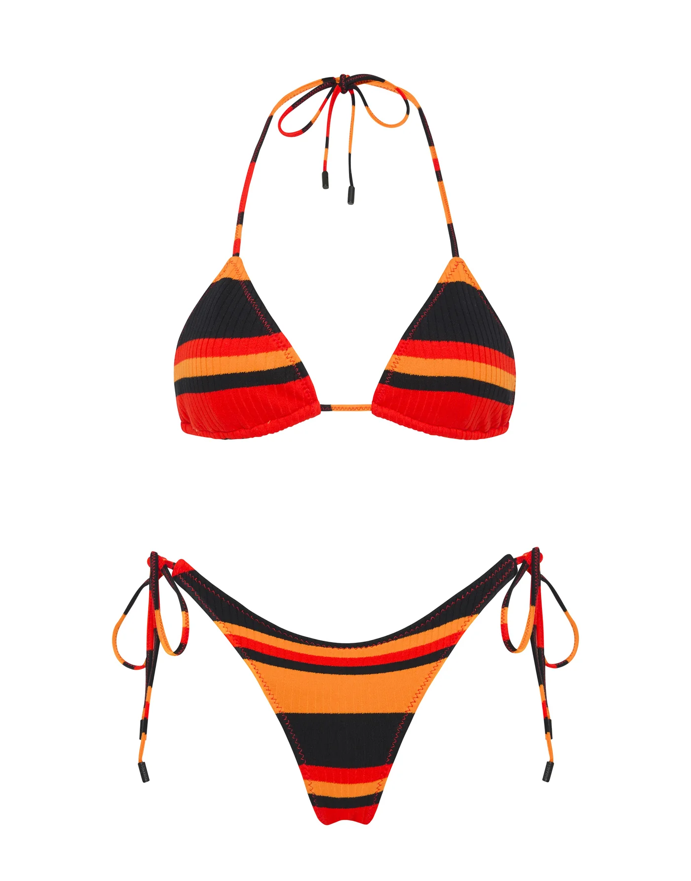 A ribbed side-tie bikini. Fully adjustable triangle top and bottoms with self-tie fastenings. Choose from either cheekiest or cheeky bottoms. This bikini also comes with a neoprene zip bag.