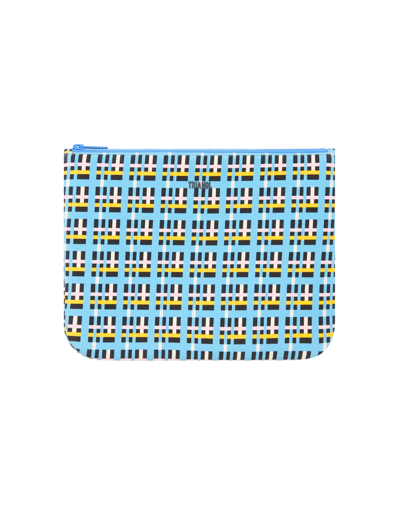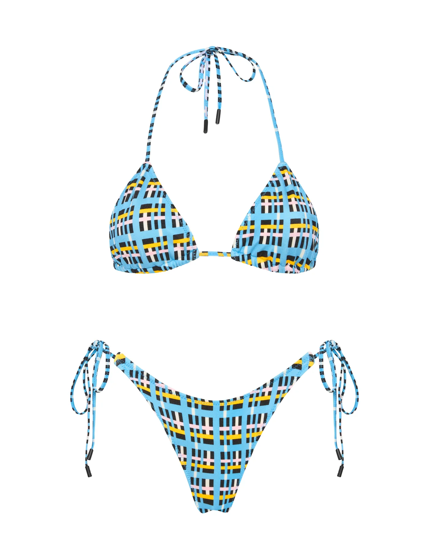 A printed side-tie bikini in blue. Fully adjustable triangle top and bottoms with self-tie fastenings. Choose from either cheekiest or cheeky bottoms. This bikini also comes with a neoprene zip bag.
