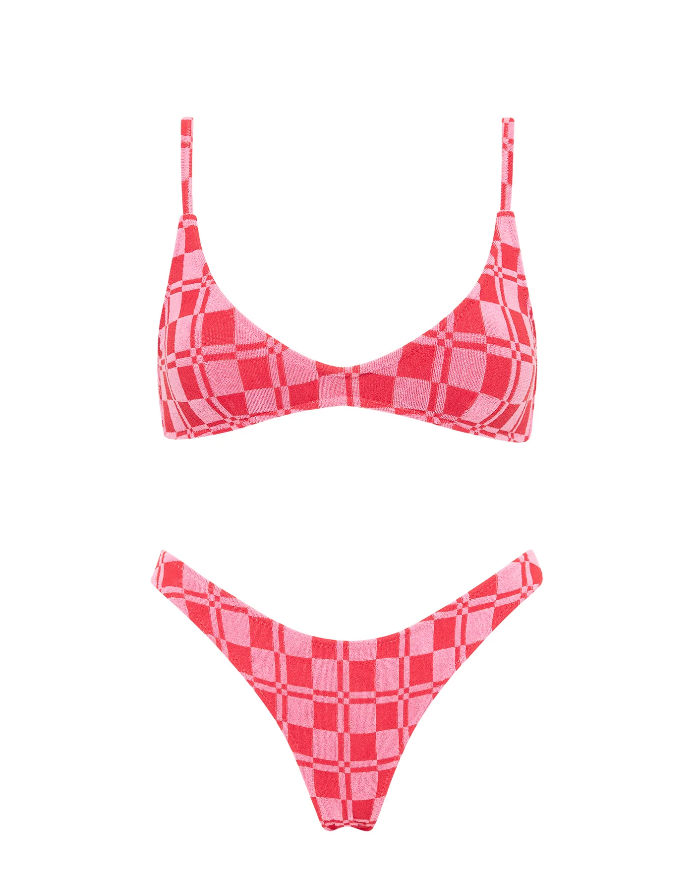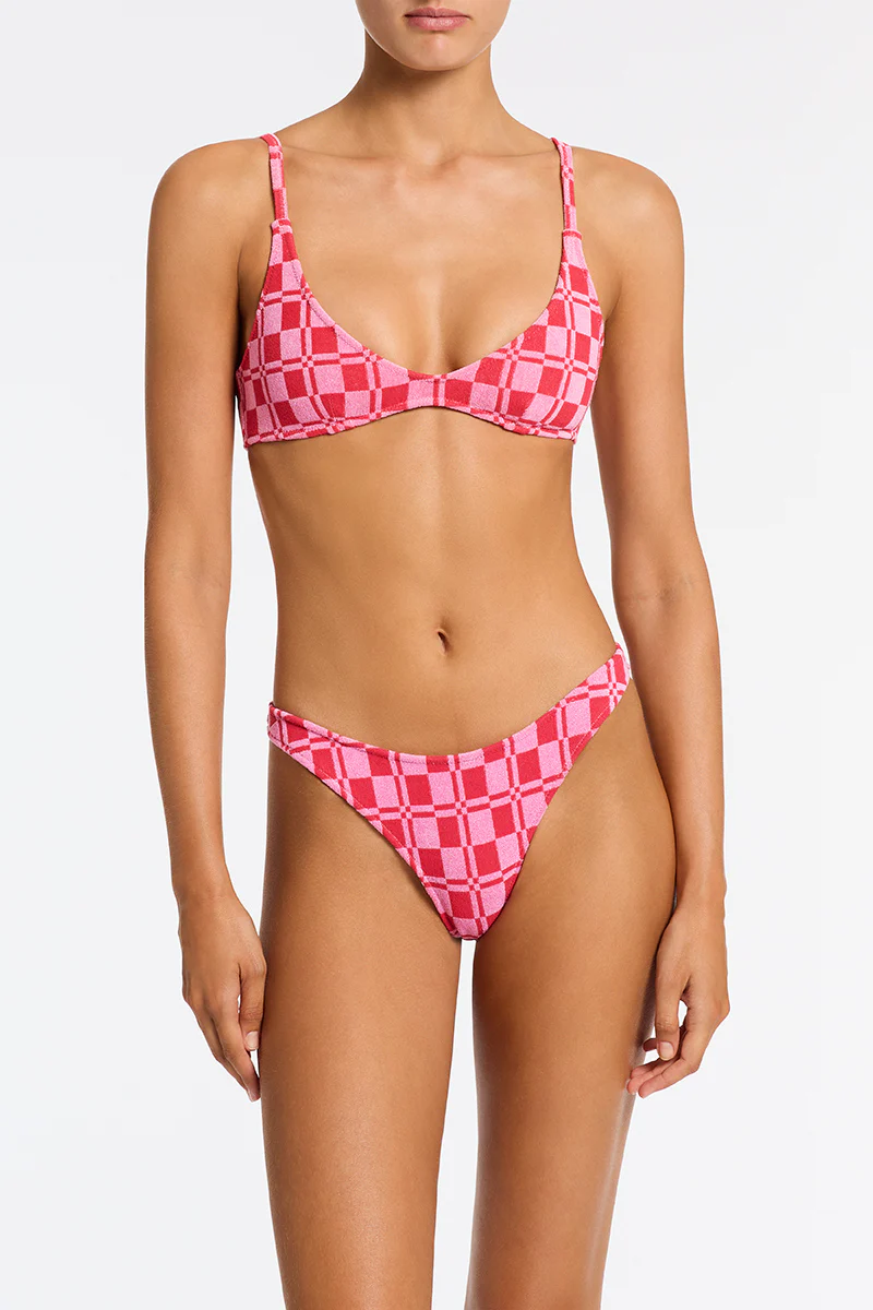 A printed deep scoop crop bikini top in pink check with matching high waist bottoms. Strappy crop top with adjustable shoulder straps and back clasp fastening. Choose from either cheekiest. cheeky or normal bottom for a little more coverage. This bikini also comes with a neoprene zip bag.