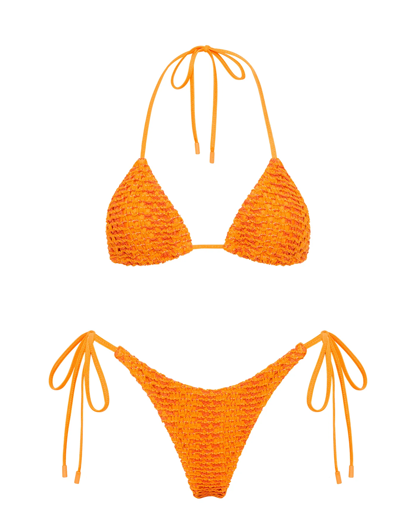 A side-tie bikini in orange crochet. Fully adjustable triangle top and bottoms with self-tie fastenings. Choose from either cheekiest or cheeky bottoms. This bikini also comes with a neoprene zip bag.