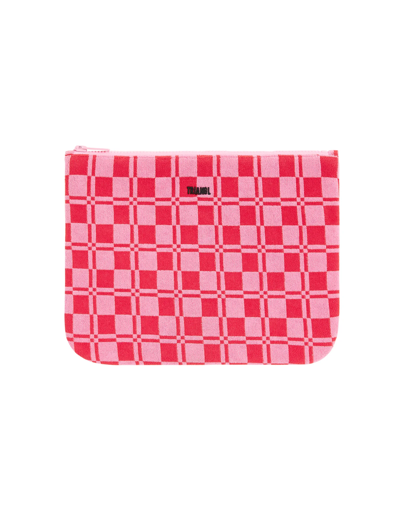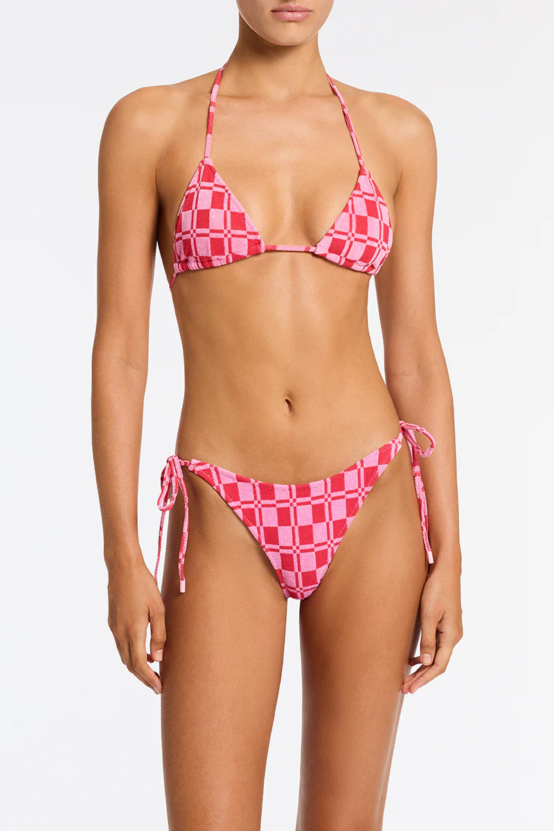 A printed side-tie bikini in pink check. Fully adjustable triangle top and bottoms with self-tie fastenings. Choose from either cheekiest or cheeky bottoms. This bikini also comes with a neoprene zip bag.