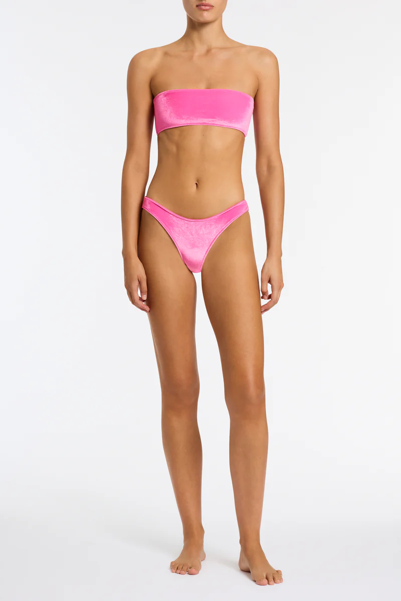 A bandeau bikini top in pink velvet with matching high waist bottoms.Choose from either cheekiest. cheeky or normal bottom for a little more coverage. This bikini also comes with a neoprene zip bag.
