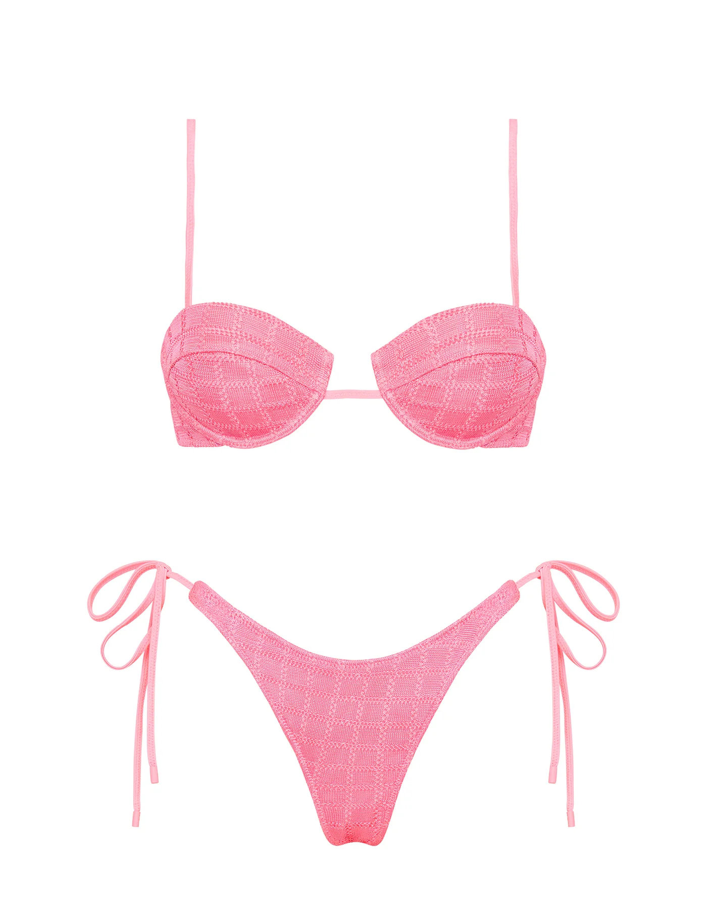 A textured bra style top in pink featuring a non-padded cup with adjustable shoulder straps and back clasp fastening with self-tie bottoms. Choose from either cheekiest or cheeky bottoms. This bikini also comes with a neoprene zip bag.