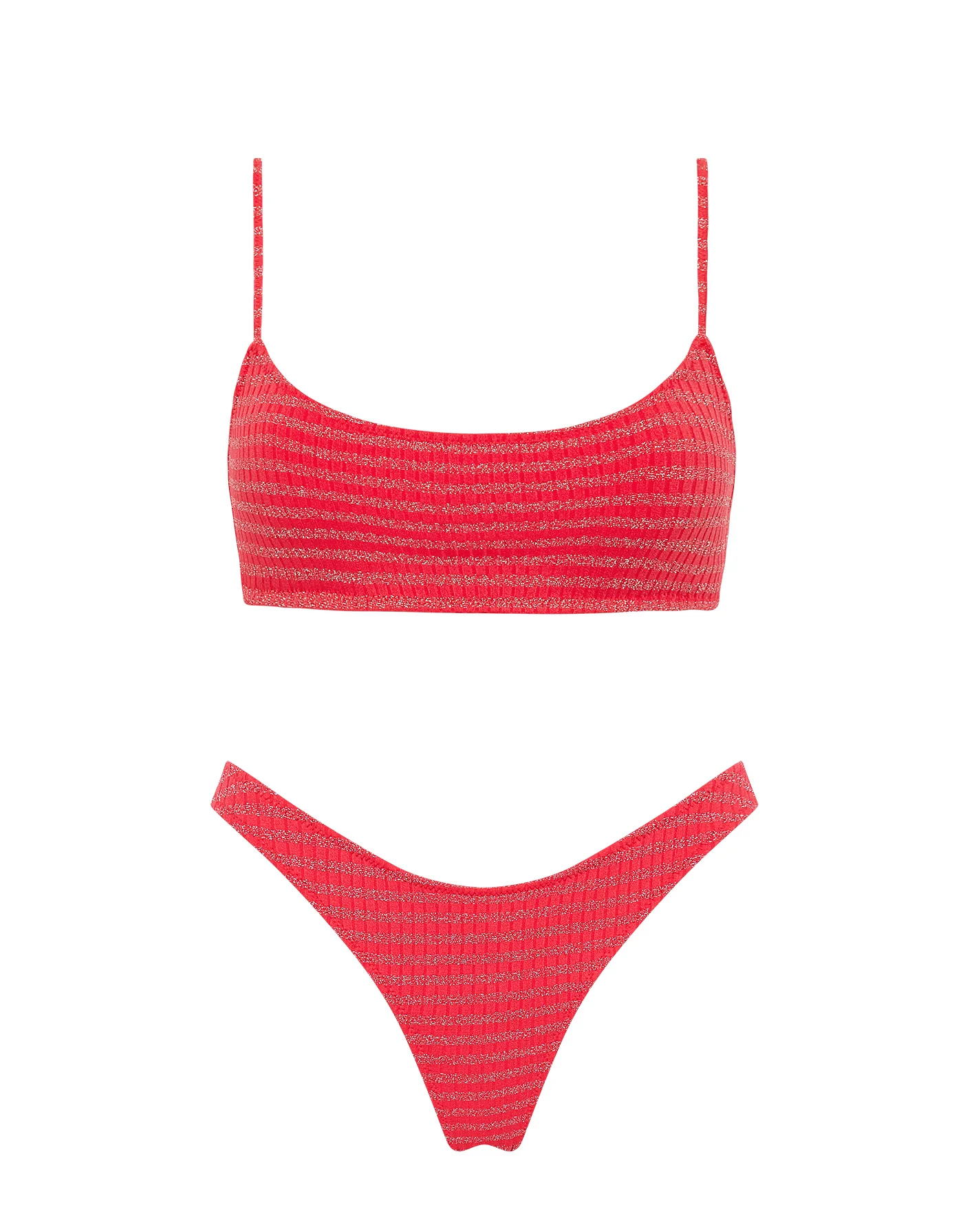 A ribbed scoop crop bikini top in red sparkle with matching high waist bottoms. Strappy crop top with adjustable shoulder straps and back clasp fastening. Choose from either cheekiest. cheeky or normal bottom for a little more coverage. This bikini also comes with a neoprene zip bag.