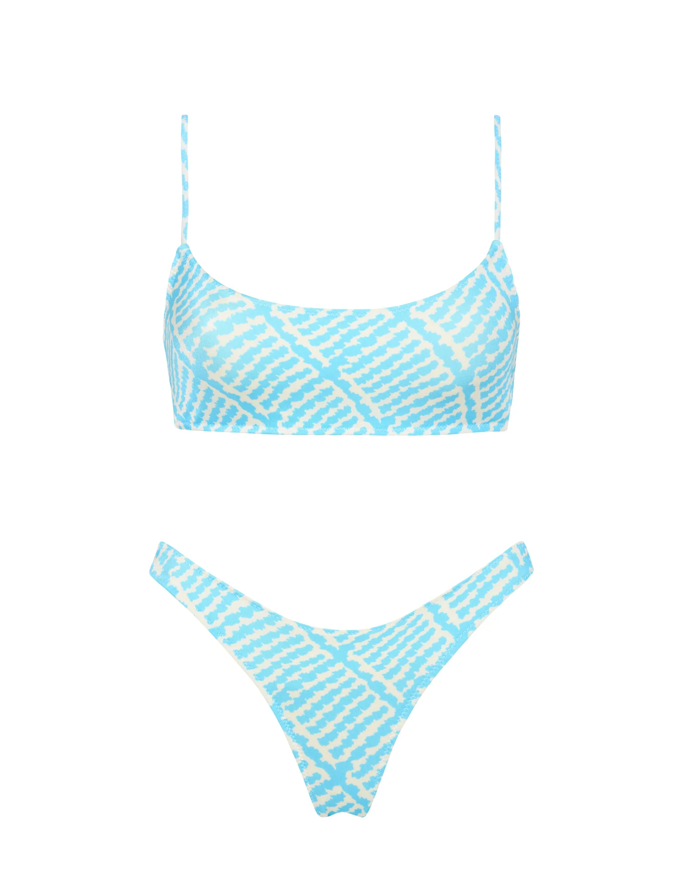 A printed scoop crop bikini top in blue and white with matching high waist bottoms. Strappy crop top with adjustable shoulder straps and back clasp fastening. Choose from either cheekiest. cheeky or normal bottom for a little more coverage. This bikini also comes with a neoprene zip bag.