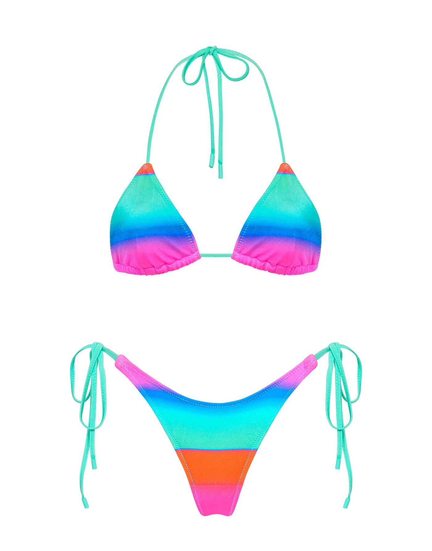 A side-tie bikini in multicolour stripe. Fully adjustable triangle top and bottoms with self-tie fastenings. This bikini also comes with a neoprene zip bag.
