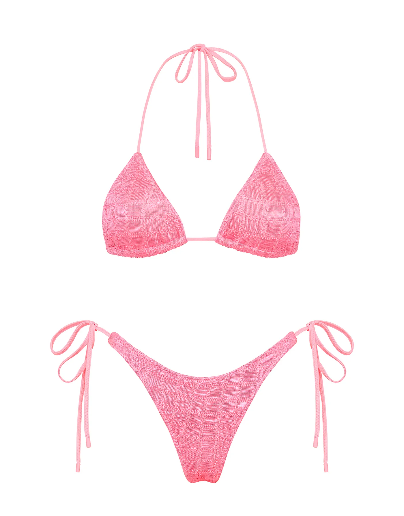 A textured side-tie bikini in pink. Fully adjustable triangle top and bottoms with self-tie fastenings. Choose from either cheekiest or cheeky bottoms. This bikini also comes with a neoprene zip bag.
