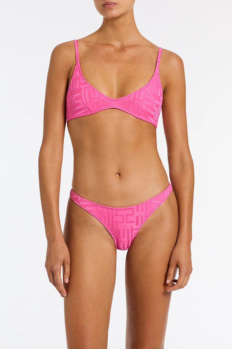 A deep scoop crop bikini top in pink with matching high waist bottoms. Strappy crop top with adjustable shoulder straps and back clasp fastening. Choose from either cheekiest. cheeky or normal bottom for a little more coverage. This bikini also comes with a neoprene zip bag.