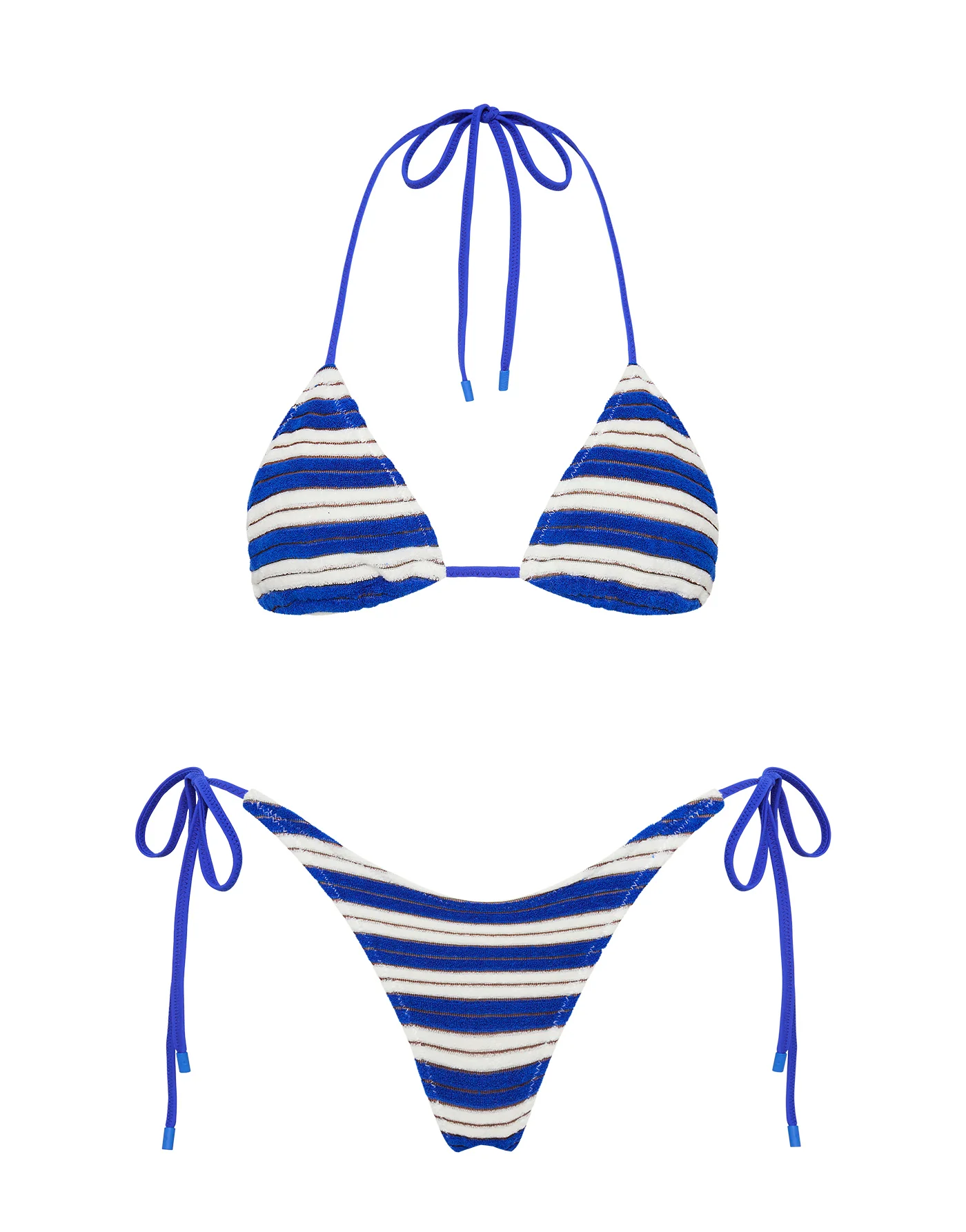 A side-tie bikini in blue and white stripe terry. Fully adjustable triangle top and bottoms with self-tie fastenings. Choose from either cheekiest or cheeky bottoms. This bikini also comes with a neoprene zip bag.