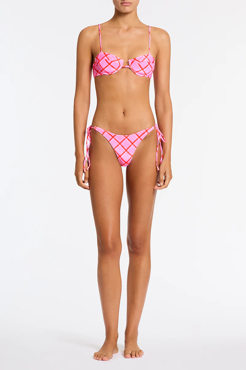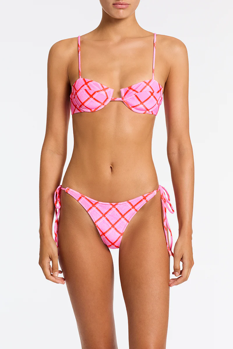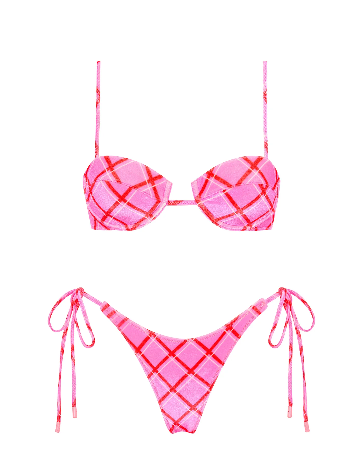 A bra style top in pink printed velvet featuring a non-padded cup with adjustable shoulder straps and back clasp fastening with self-tie bottoms. Choose from either cheekiest or cheeky bottoms. This bikini also comes with a neoprene zip bag.