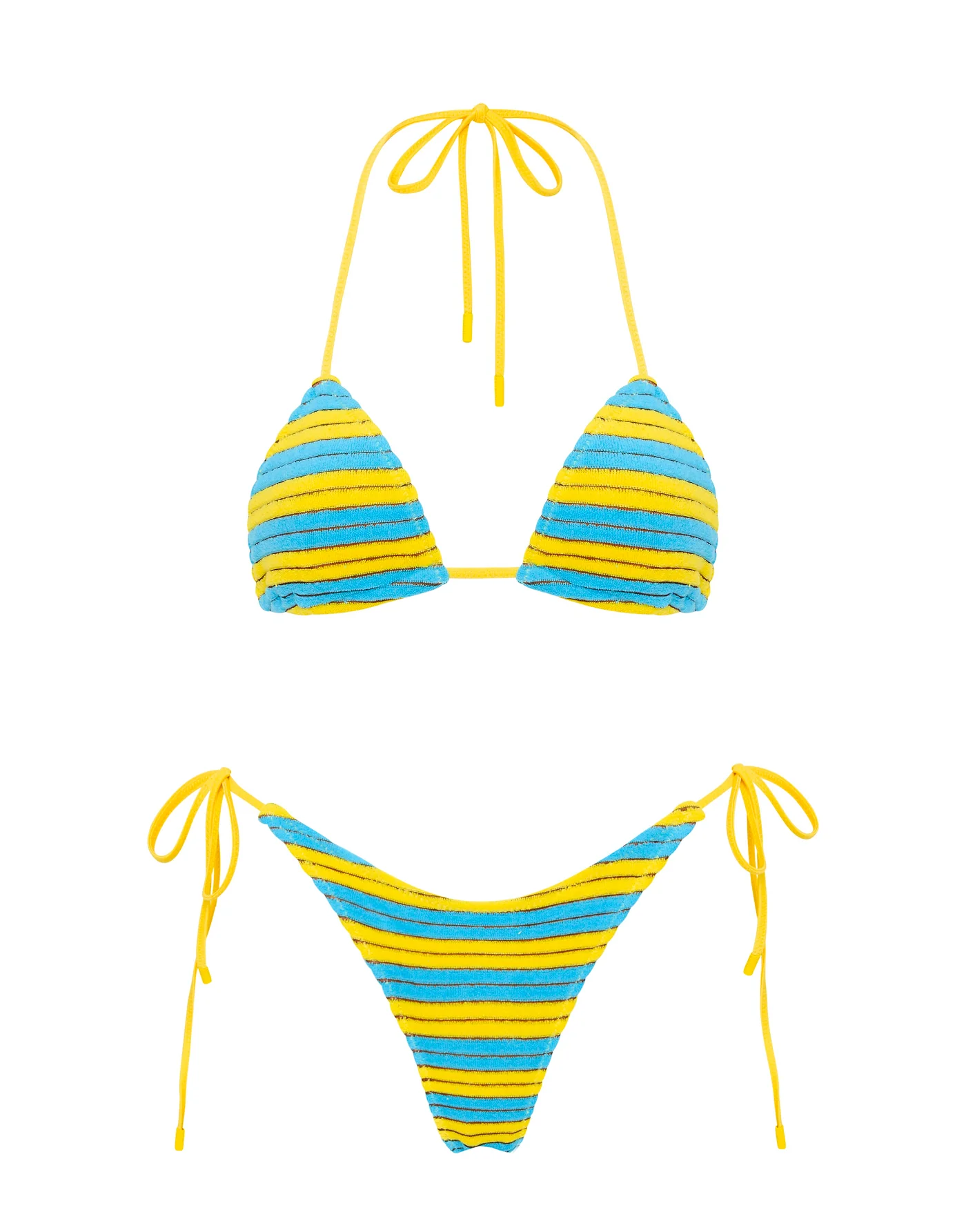 A side-tie bikini in yellow and blue stripe terry. Fully adjustable triangle top and bottoms with self-tie fastenings. Choose from either cheekiest or cheeky bottoms. This bikini also comes with a neoprene zip bag.